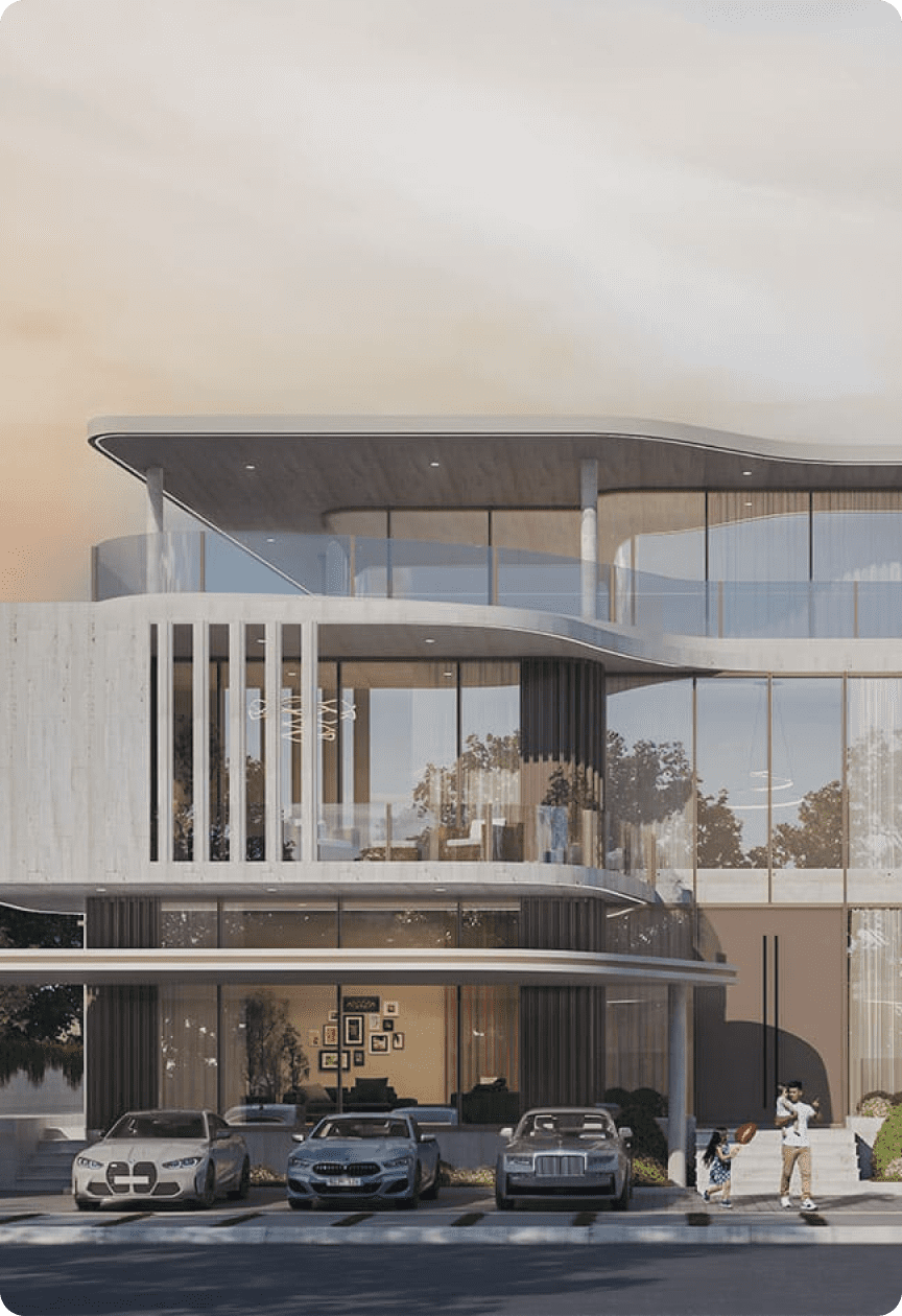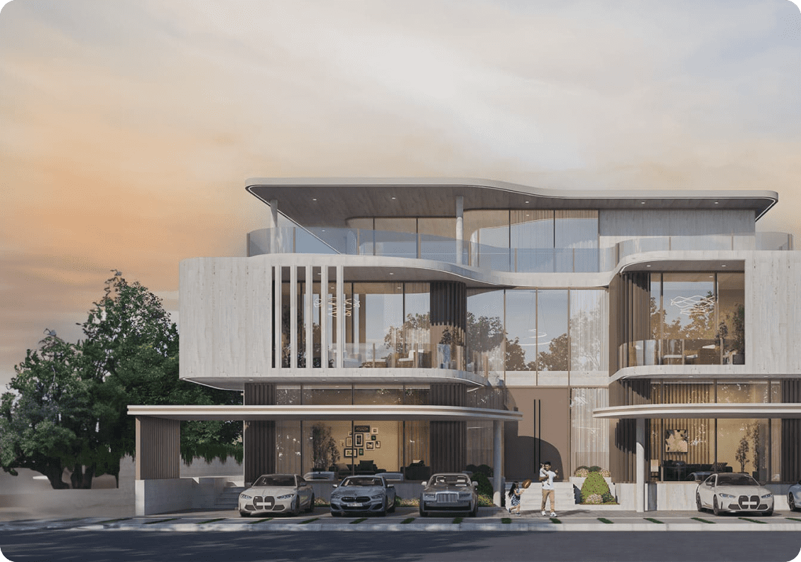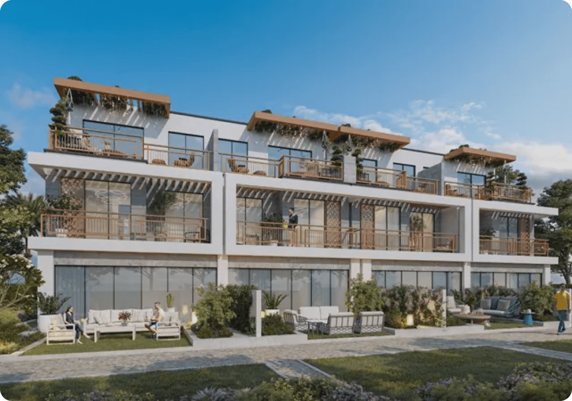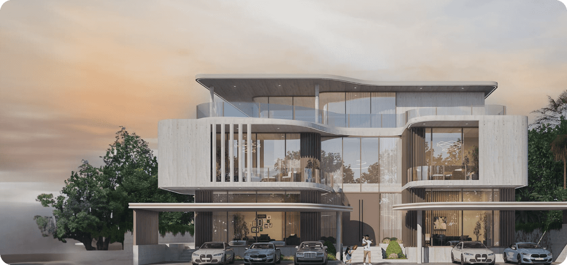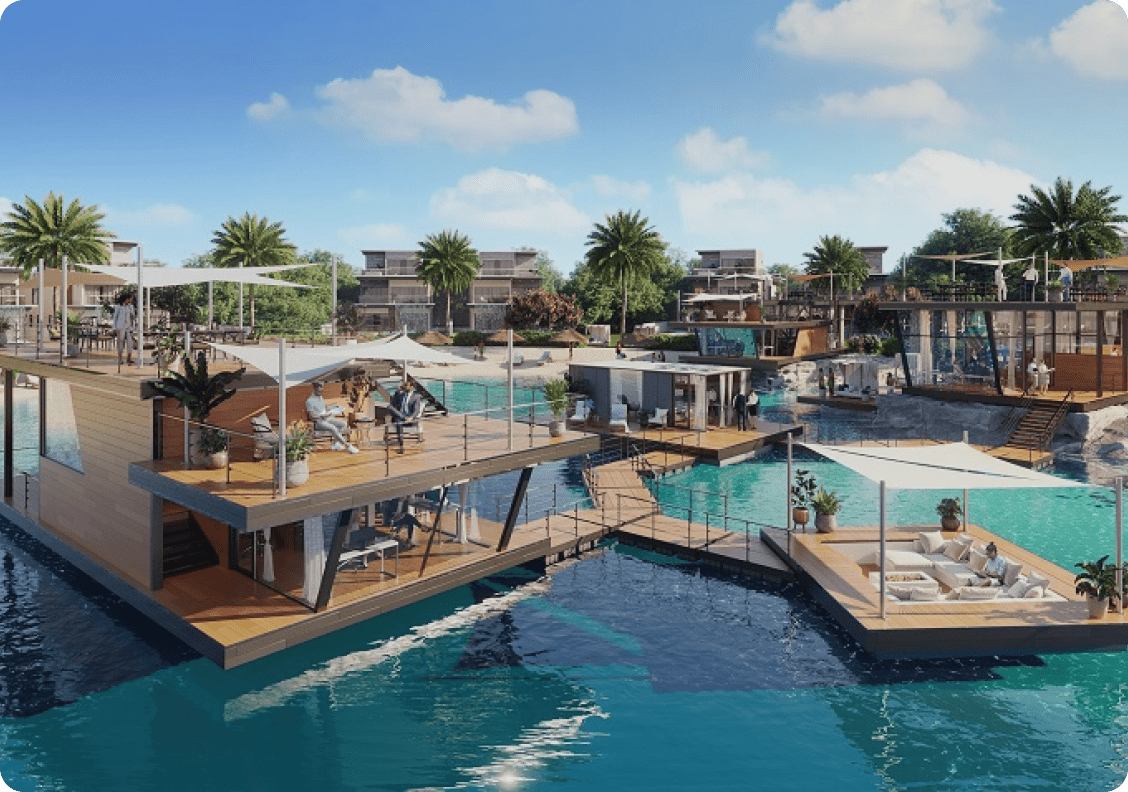Marvel at sleek, curved exteriors by the lagoon, where Mediterranean living meets luxury amidst serene water features and greenery, with sweeping balconies seamlessly blending indoor and outdoor spaces.